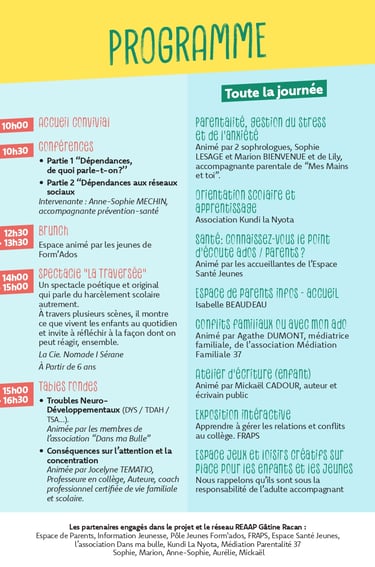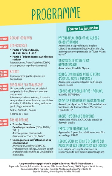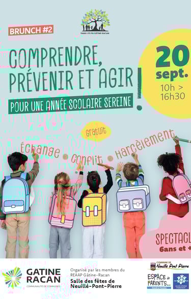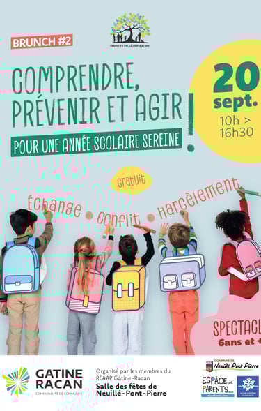 Samedi 20 septembre : 10h à 17h Brunch avec le reaap sur le thème ma scolarité (réseaux d'écoute et d'appui à la parentalité) à Neuillé pont pierre salle des fêtes, table ronde autour des TND et stand information et sensibilisation.